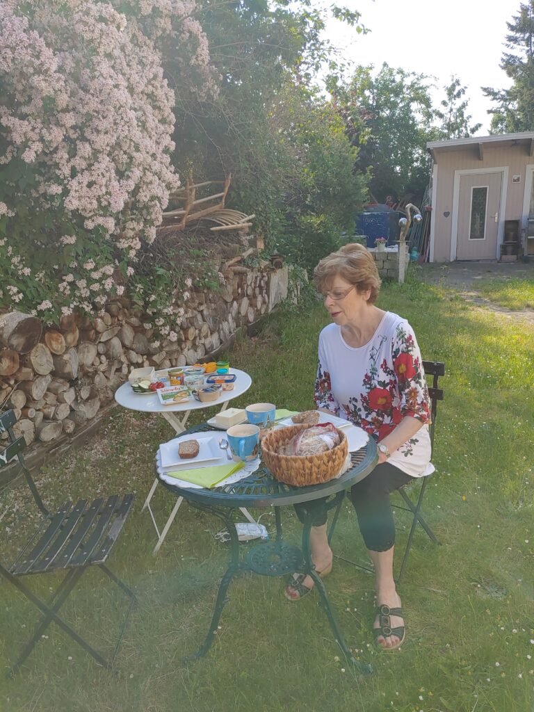Zu Hause angekommen, suchten wir im Garten ein schattiges Plätzchen für unser Frühstück. Während Heidi unter der Dusche stand, deckte ich den Tisch mit frischem Brot, Käse, Aufstrich, frischem Obst und Gemüse und Kaffee. Nach dem Nordic Walking schmeckte das Frühstück an der Frischen Luft besonders gut und wir blieben einfach bis nach 10 Uhr sitzen. Dann hüpfte ich unter die Dusche und Heidi kümmerte sich um das Abräumen und den Abwasch.